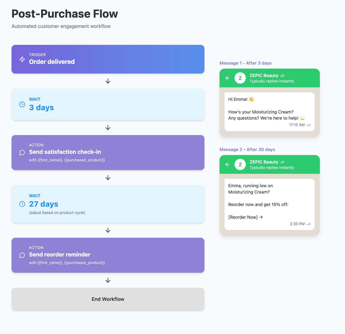 Tools: WhatsApp Business App works for <100 messages/month. For scale, use WhatsApp Business API via platforms like ZEPIC for automated personalization without coding.