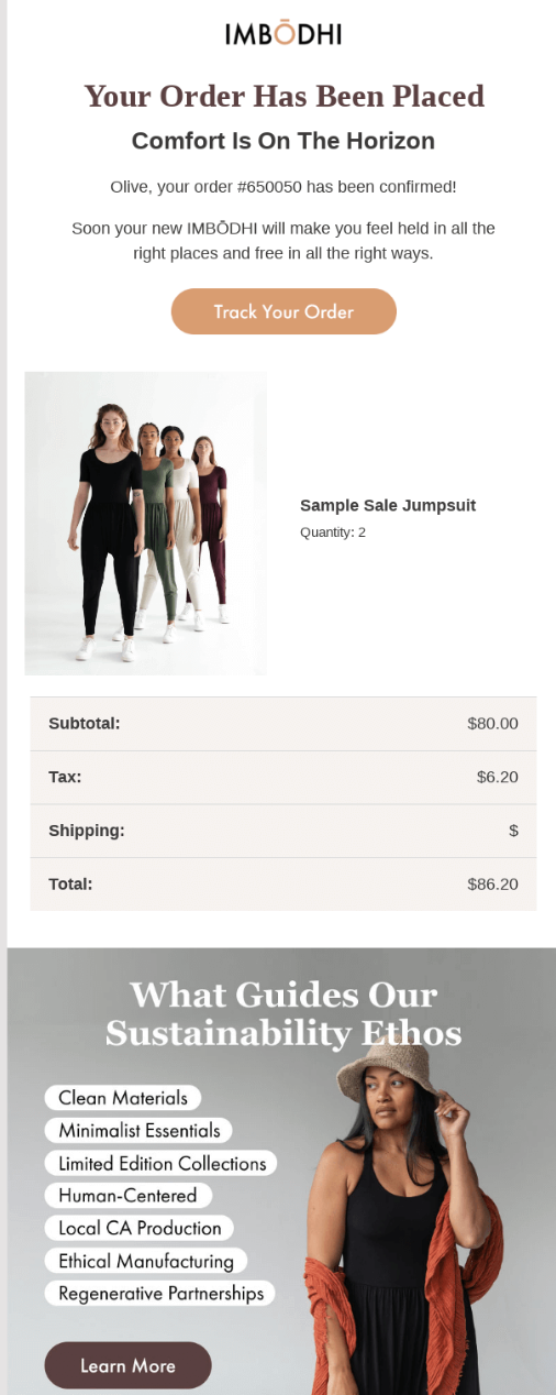 Add a short founder note or brand story snippet: A concise 50â80 word message adds personality and warmth to a typically functional emailâsomething most eCommerce transactional messages overlook.