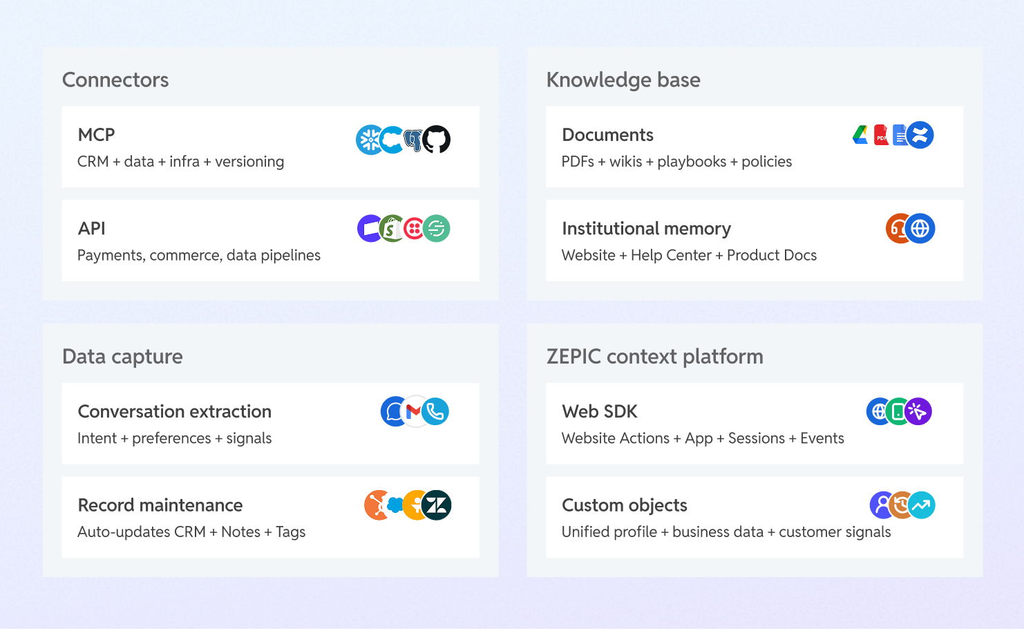 ZEPIC is the context OS. It is the layer that connects your systems, captures your signals, and maintains the real-time picture of your business that every agent needs to operate at full capability. Without ZEPIC, agents are working blind. With ZEPIC, they are working with the most complete business intelligence available.