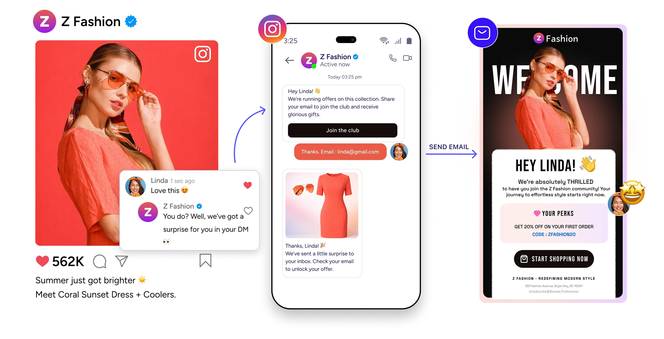Create email segments based on actual Instagram engagement—not assumptions. Send different emails to people who commented on a sustainable fashion post versus those who watched your sale Story, or instantly reach everyone who DM’d you in the last 24 hours. Every message is triggered by what they actually did.