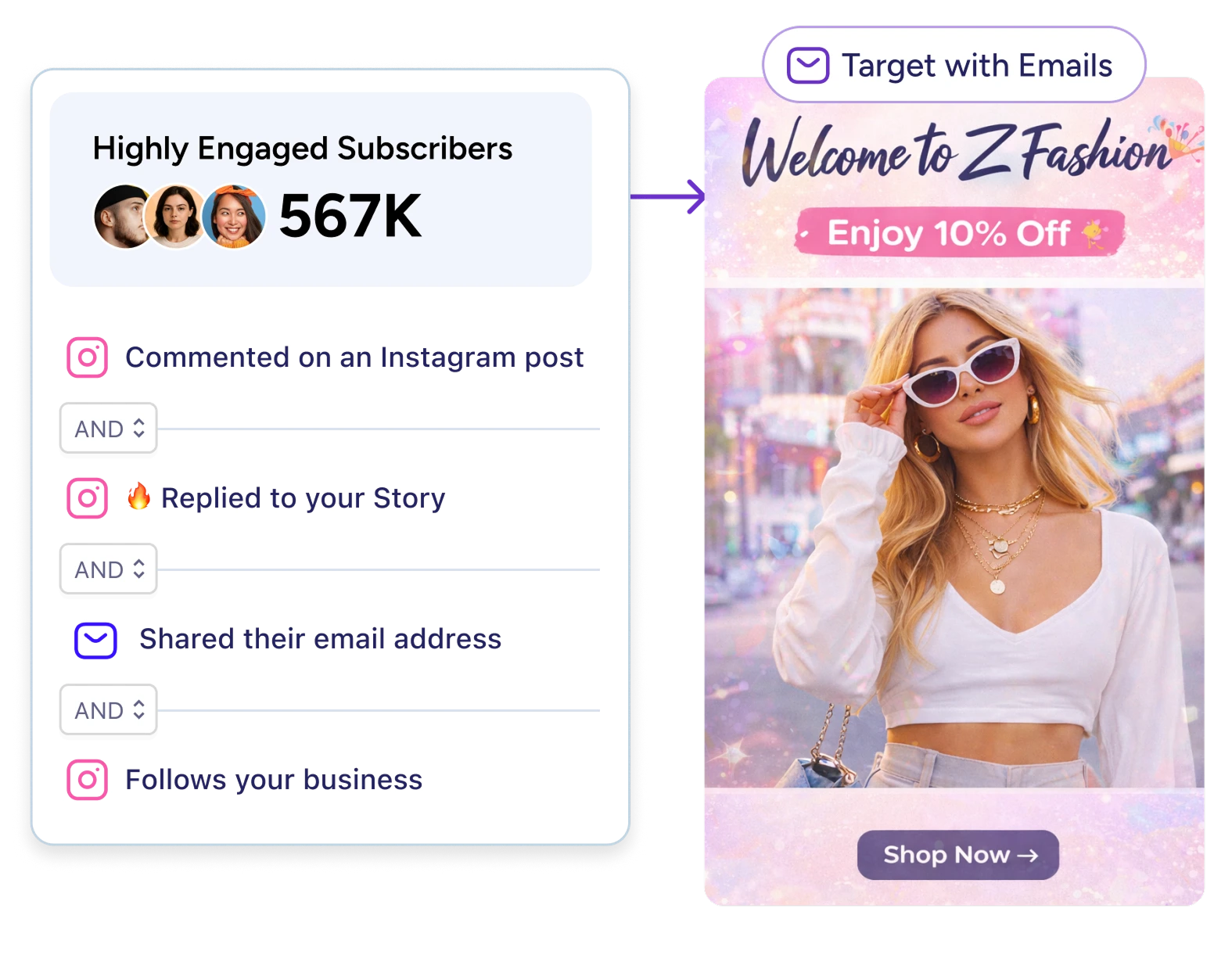 Manage retention flows from one place. Send welcome emails, event invitations, loyalty rewards, and promotions for your Instagram audience along with the ones in your lists. Connect your CRM, shopify and other platforms, coordinate campaigns, and keep long-term engagement running—without switching tools.