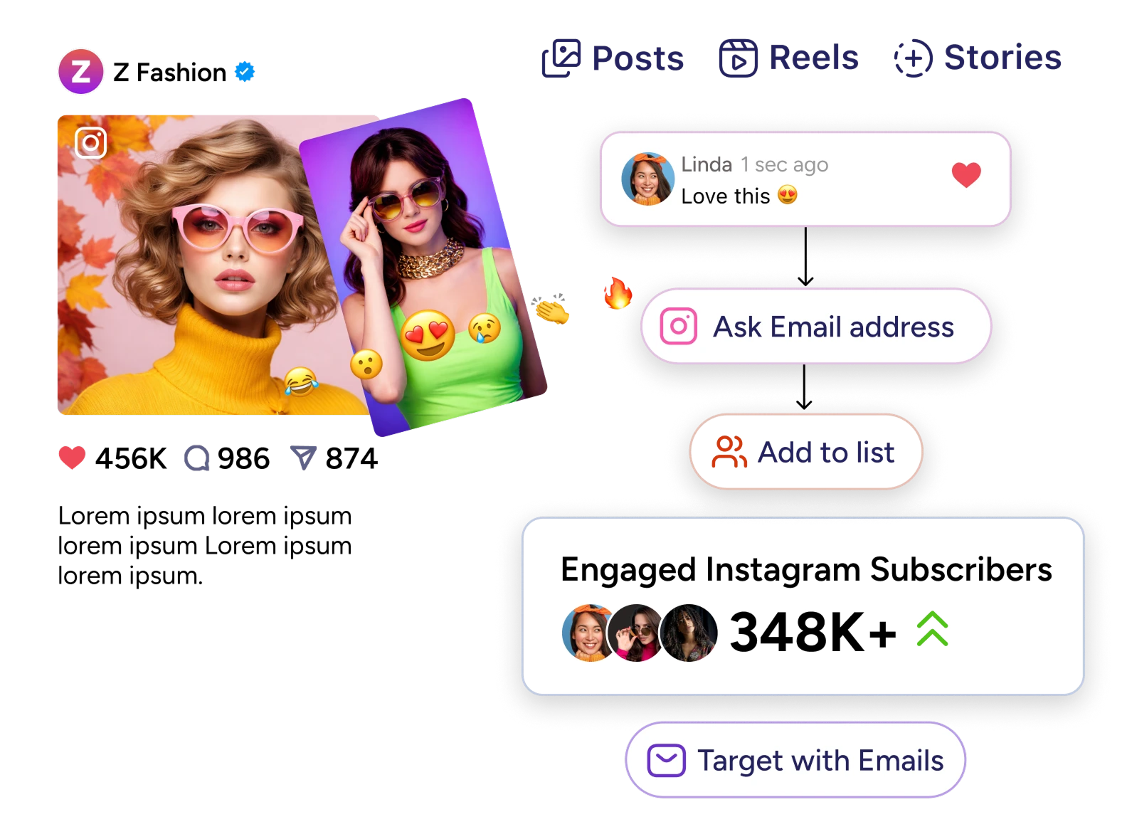 Convert Instagram engagement directly into email subscribers. When someone comments, sends a DM, or reacts to your story, automated flows capture their email at the moment of peak interest. Your list grows continuously, without forms or manual effort, while you focus on creating content.