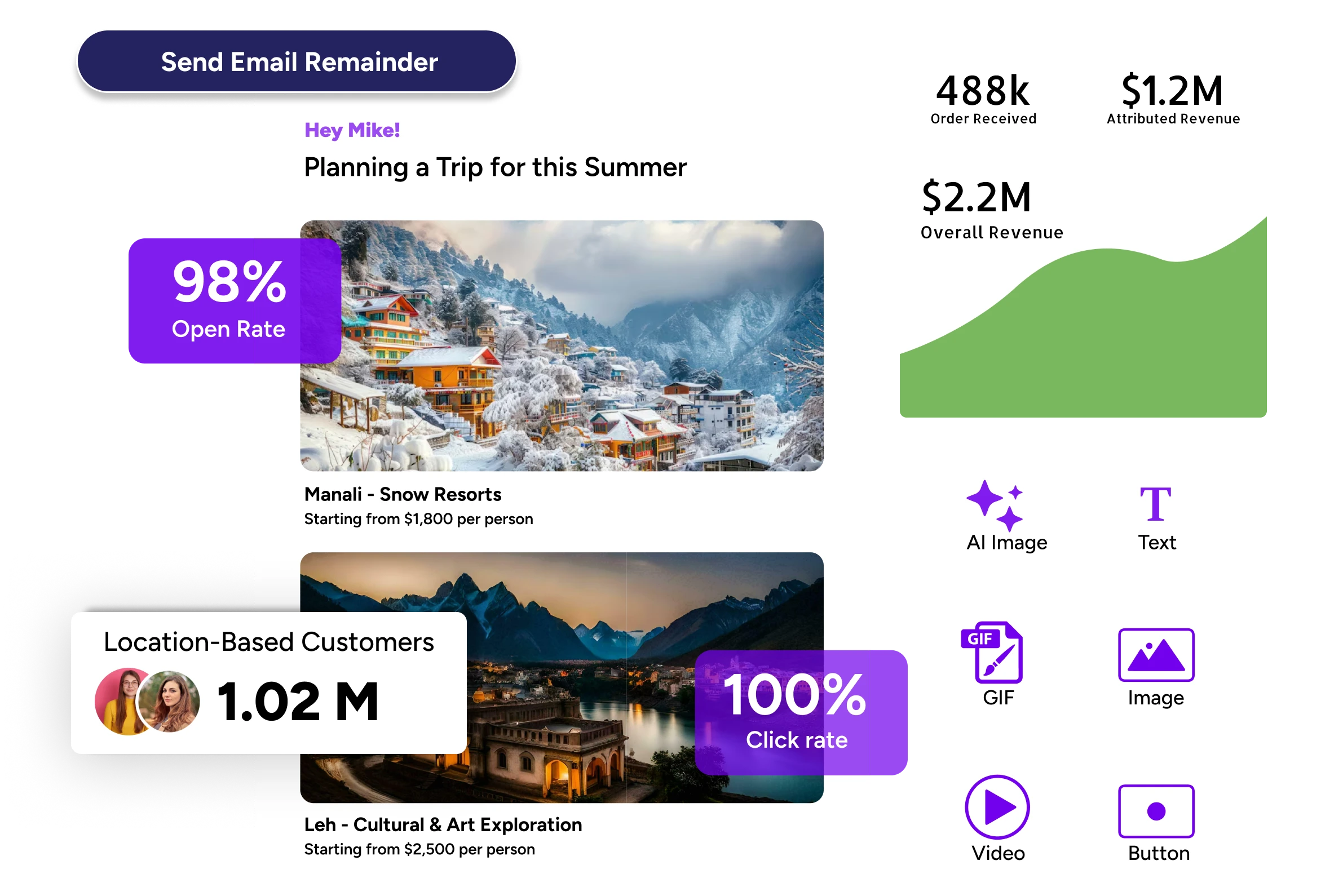 Enables personalized itineraries, booking reminders, follow-ups, and promotional sequences for hotels, tours, and travel experiences.
