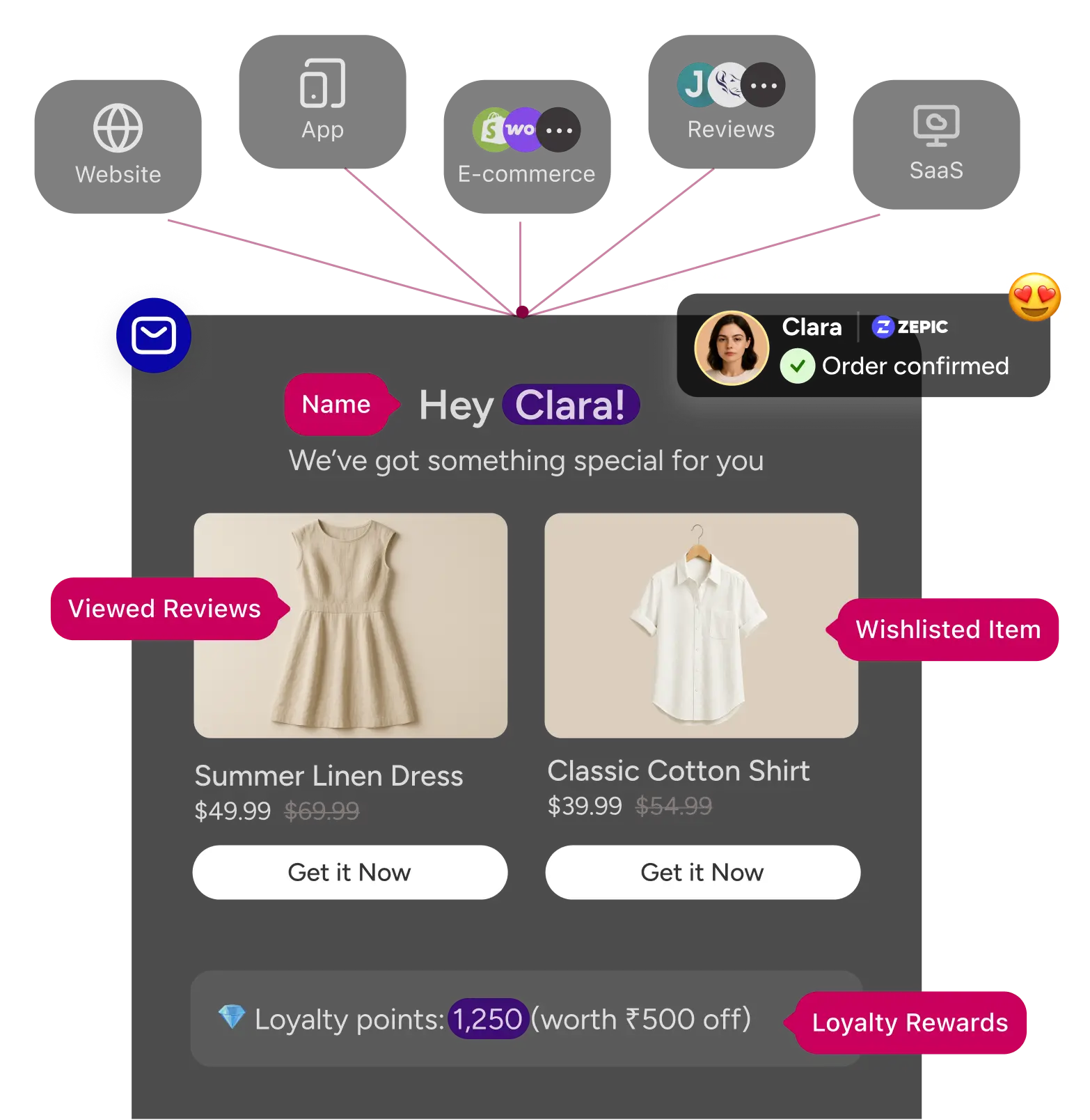 ZEPIC pulls in orders, reviews, loyalty data, support tickets, and browsing behavior, so every message has context.