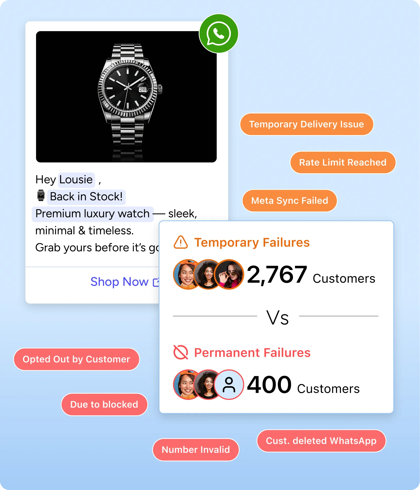 Not every failure should be retried. Smart Retries identifies which delivery issues are temporary—like Meta rate limits, engagement quality filters, or business limits—and which are permanent, such as opt-outs or invalid numbers. Only messages with a real chance of success are retried.
