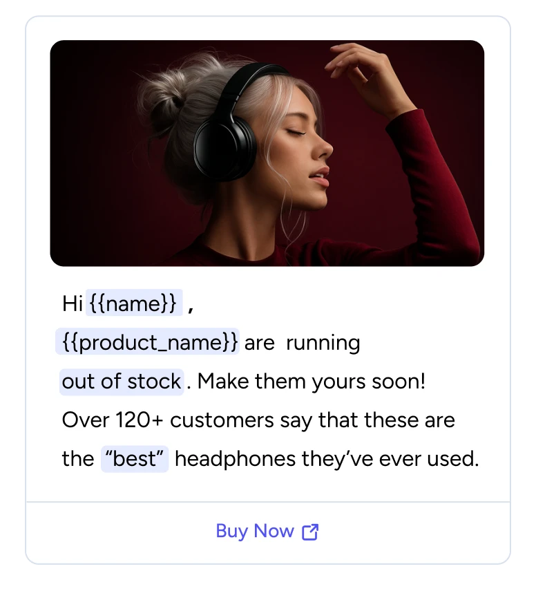 Use dynamic merge tags to insert customer name, order details, product information, or any customer attribute. Pull data from your entire tech stack to personalize messages with information that's relevant to each customer.