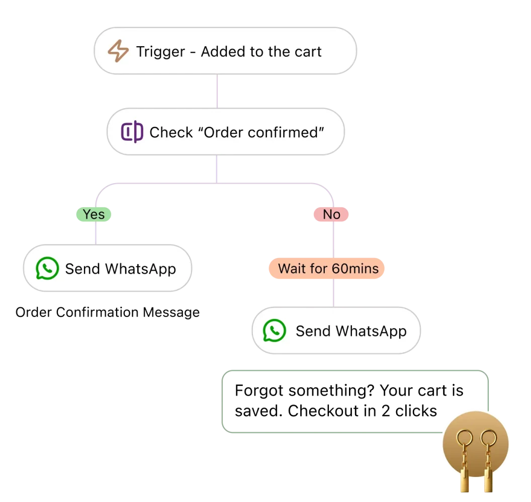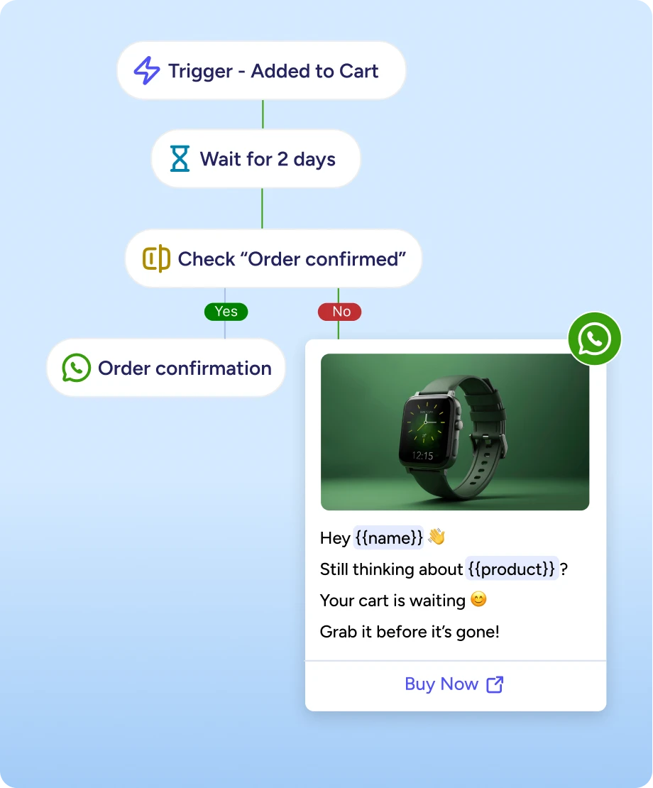 Shoppers abandon carts constantly, and manual follow-ups don’t scale. With WhatsApp automation, messages trigger the moment a cart is abandoned, sending personalized reminders, product details, and timely offers without any manual intervention.