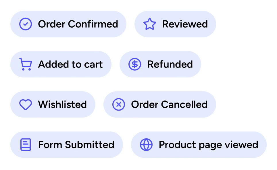 Trigger WhatsApp messages based on any customer action like product views, cart abandonment, form submissions, or custom events you define. Automate responses to what customers actually do.