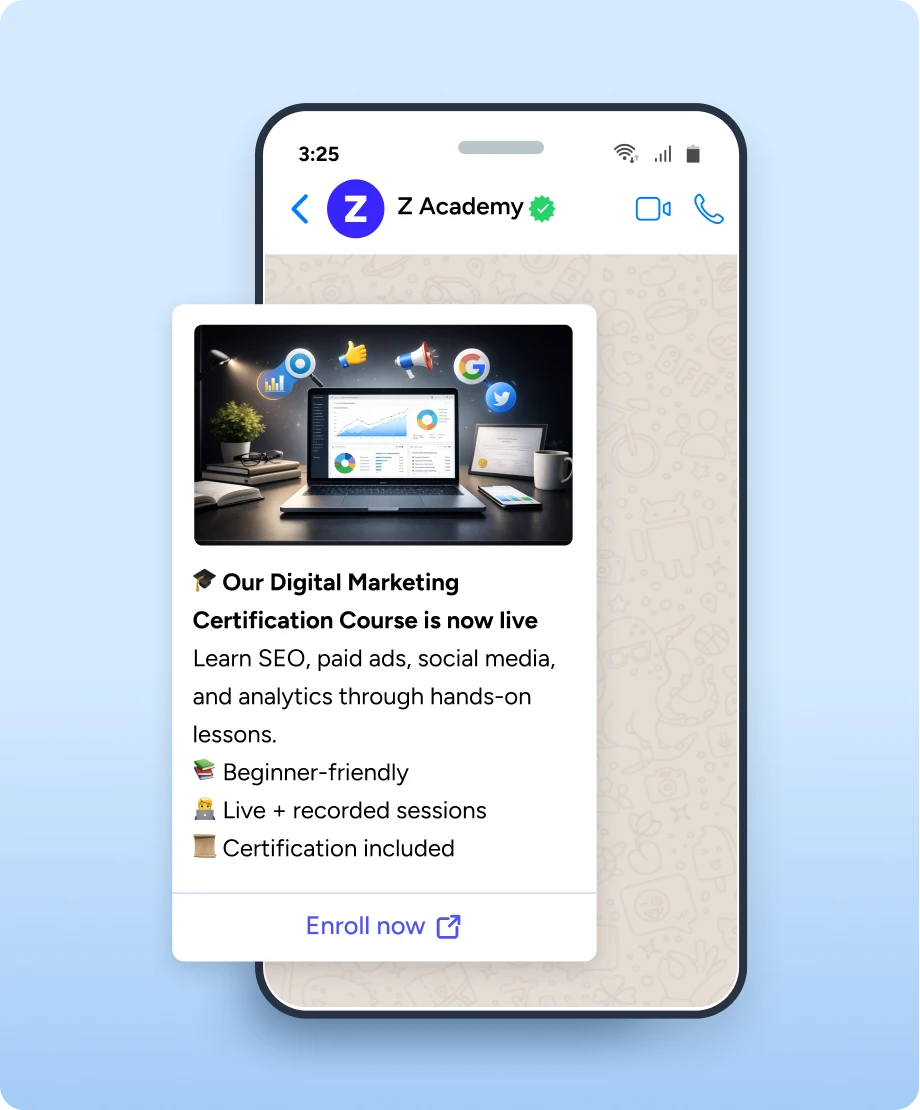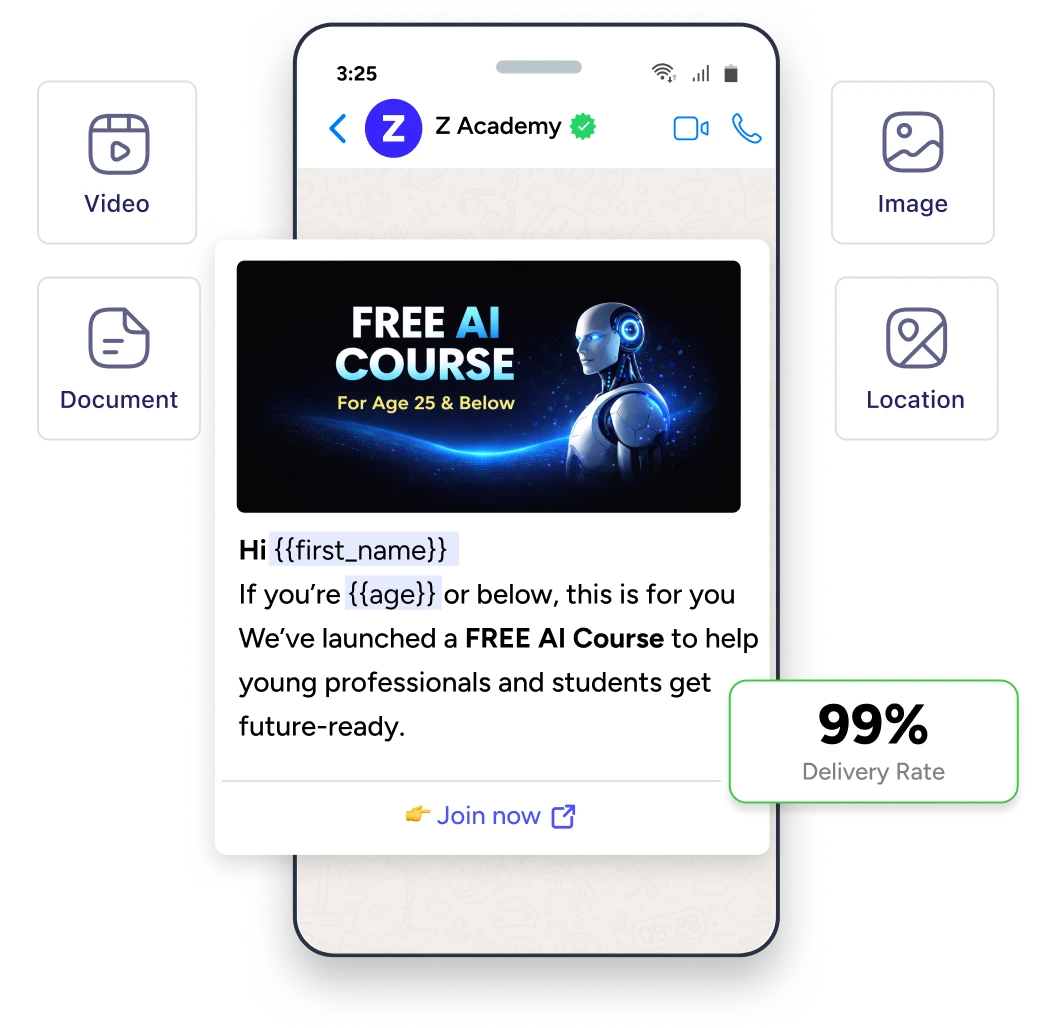 Yes. ZEPIC's WhatsApp broadcast platform supports rich media broadcasts including images, videos, PDFs, and documents. Add interactive CTA buttons ("Shop Now," "View Details") or quick reply buttons to drive action in your WhatsApp business broadcasts. Rich media messages increase engagement significantly compared to text-only broadcasts.